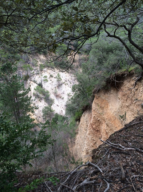 C’est là que l’aventure commence, dans le ravin de Bramadou, d’abord juste quelques ravinements crayeux blancs à gauche, et un sol légèrement caillouteux. Si on s’approche du bord, on se rend compte que seules quelques racines de pins maintiennent encore en place le bord du sentier qui s’écroulera tôt ou tard. Bientôt le sable gris sous nos pas nous entraîne dans la descente : le rythme ralentit par peur de glisser. De chaque côté, un ravin profond marneux aux pentes dénudées, et entre les deux, un maigre sentier qu’il nous faut prudemment emprunter pour continuer notre chemin. Sous nos pas parfois, des plaques de calcaires. Un petit arrêt pour observer la profondeur du ravinement donne des frissons. Majo a raison : ce paysage détritique ressemble à celui que nous avions vu aux Mées (04).